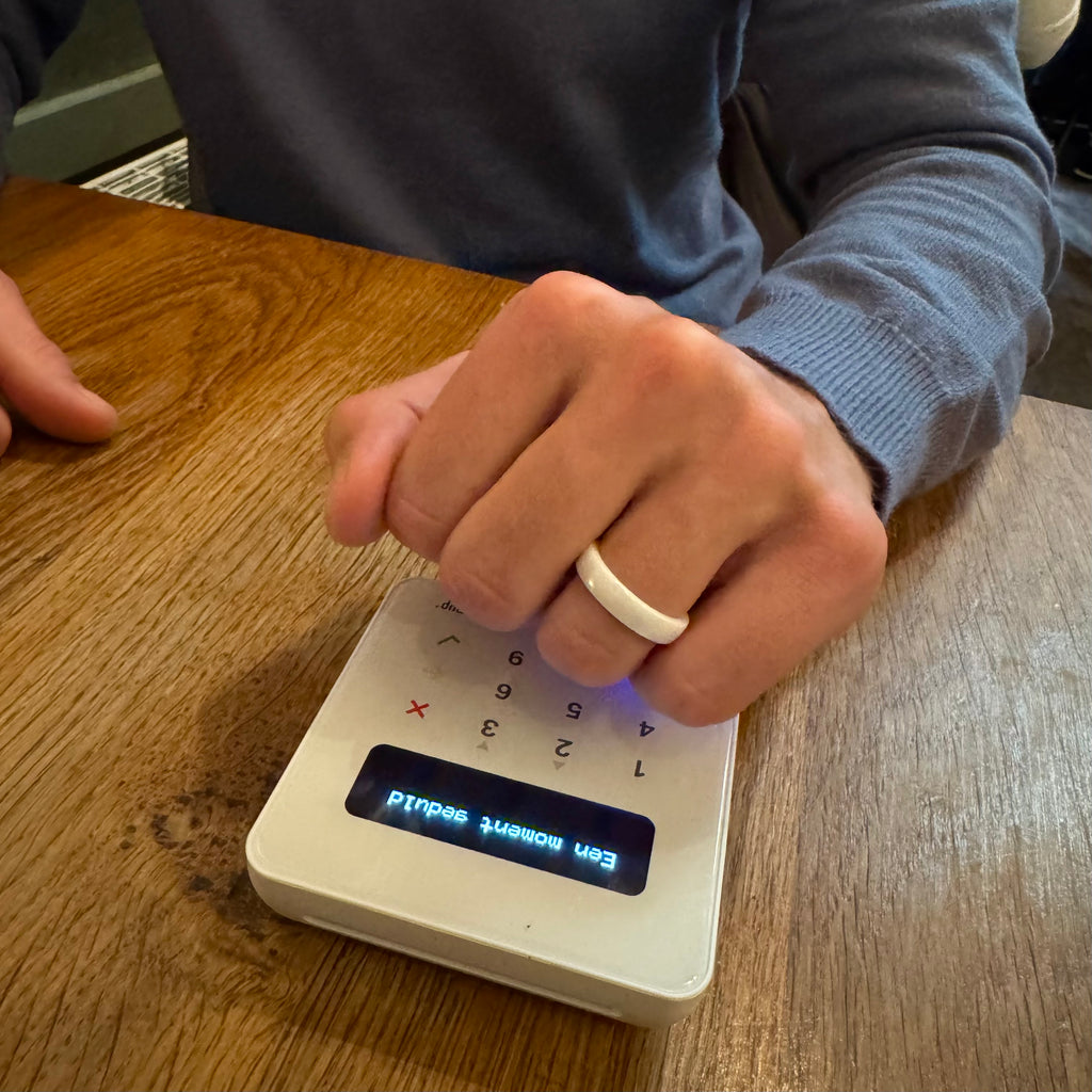 Wie funktioniert das Bezahlen mit unserem Ring? Gib dem Kartenlesegerät einfach einen Klaps und du kannst kontaktlos bezahlen! Vergiss nicht, auch der Kassierer einen Klaps zu geben. Unser Ring enthält auch unsere neueste Funktion; deine eigene digitale Visitenkarte. Lies hier mehr über die Funktionen unserer Artikel.