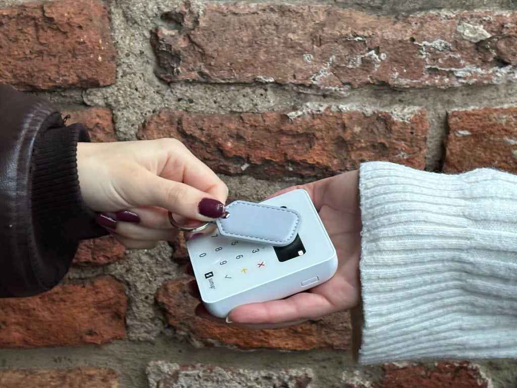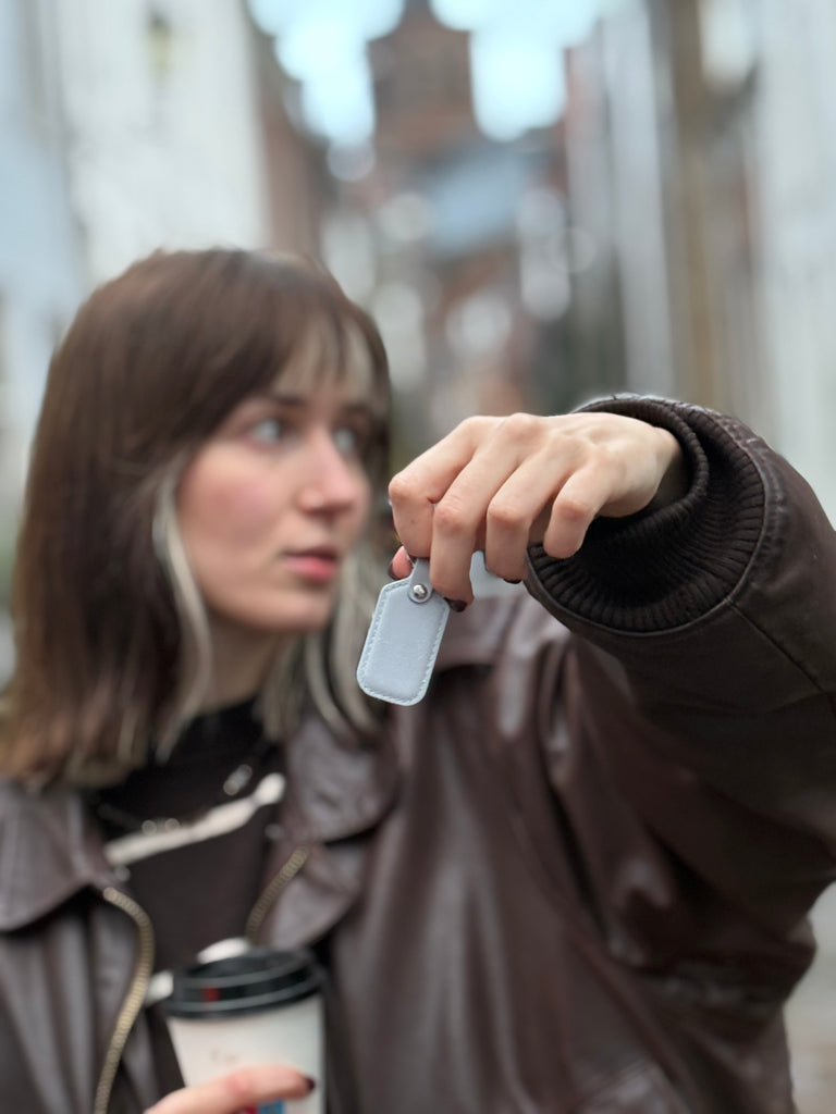 This handmade leather key ring with integrated payment chip is available in different colors.
